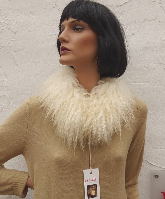 Naturbelassenes, lockiges, seidenweiches Pelzaccessoire aus Wensleydale-Schaffell. Besticht durch seine natürliche Schönheit. Die Farbe ist ein wollweiß wie gewachsen.