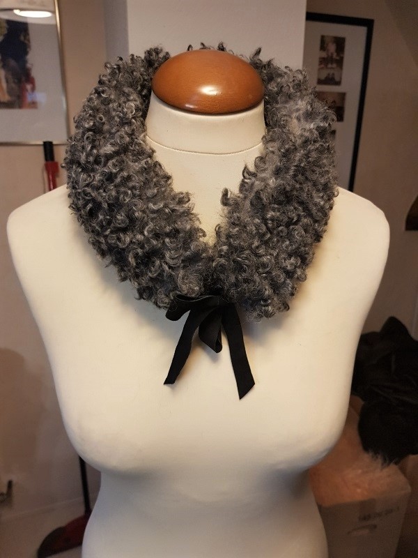 Naturbelassenes, kurzhaariges, lockiges Pelzaccessoire aus deutschem Gotland-Schaffell. Anschmiegsam und weich. Naturfarbe, wie gewachsen, ich bezeichne sie als anthrazith-grau.